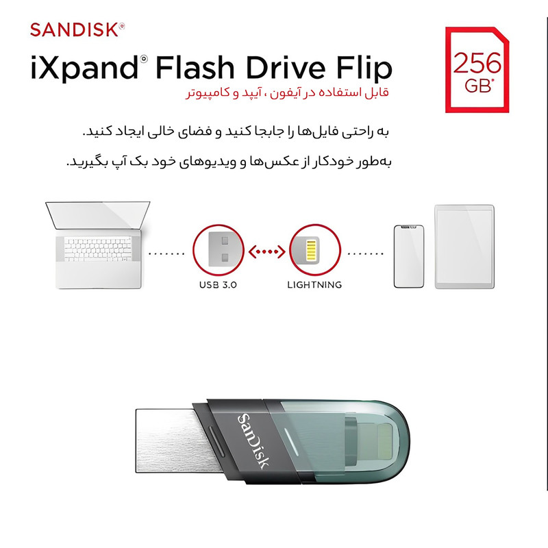 فلش مموری سن دیسک مدل IXPAND FLIP ظرفیت 256 گیگابایت با رابط Lightning / USB